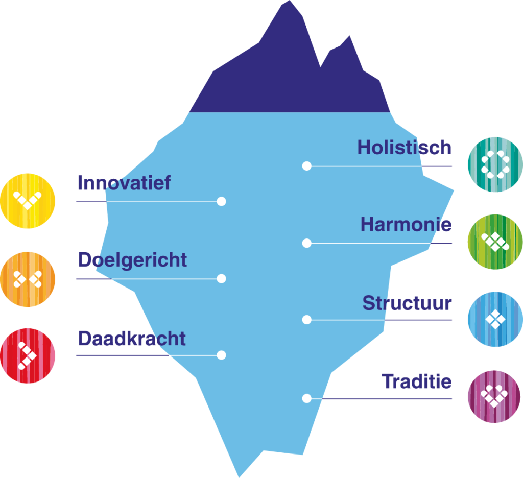In het onderliggende gedeelte van de ijsberg bevinden zich de verborgen drijfveren die MyDrives naar de oppervlakte haalt. In het bovenste gedeelte is het gewoontegedrag zichtbaar. De persoonlijke drijfveren onder water sturen het gewoontegedrag boven water.